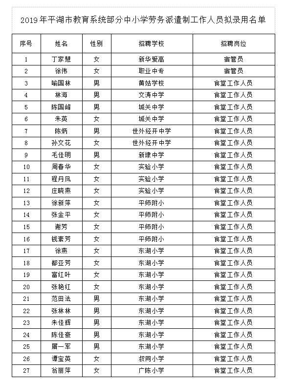 2019年平湖市教育系统部分中小学劳务派遣制 工作人员拟录用名单公示